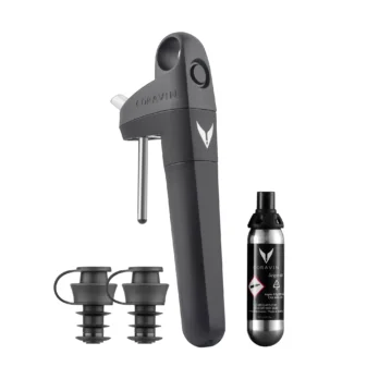 W zestawie znajdują się dwa Coravin Pivot Stoppers czy korki, jedna kapsułka gazu (Argon) oraz pokrowiec na butelkę.